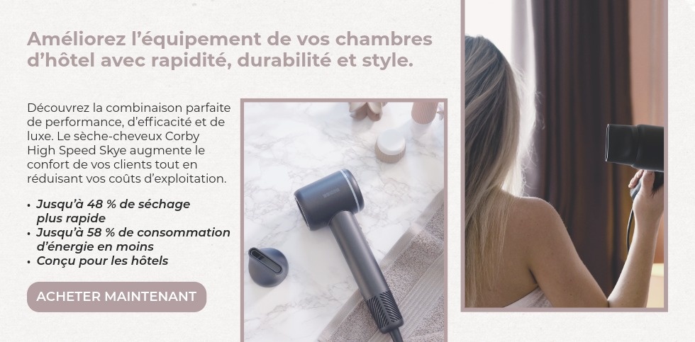 Corby of Windsor propose des sèche-cheveux et accessoires qui s'accommodent parfaitement pour la chambre d'hôtel.